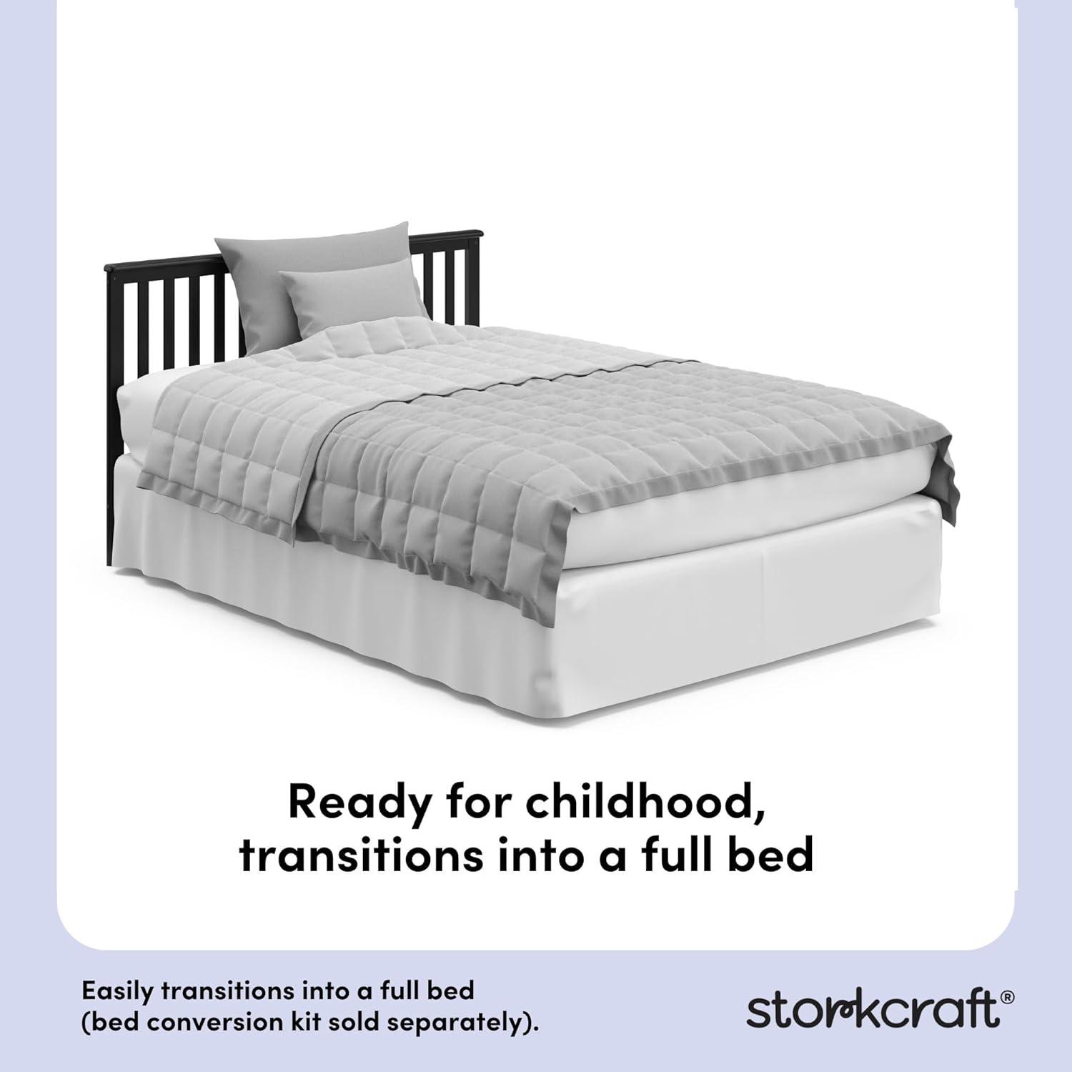 Bring your dream nursery to life with the Storkcraft Hillcrest 4-in-1 Convertible Crib. With its timeless, versatile design and classic details, the Hillcrest is the perfect addition to any nursery – no matter your style. The Hillcrest is crafted from pine wood and engineered wood, and its applied finish has been tested to meet or exceed the applicable ASTM and CPSIA safety standards. The Hillcrest is JPMA Certified — meaning it’s been expert tested by third-party, accredited laboratories to meet or exceed all of the applicable category voluntary and mandatory safety standards. Designed to adapt to your growing baby, the Hillcrest is equipped with an adjustable mattress support base with 4 different height options so the mattress support base’s position can be lowered as your child grows (please note, this crib may only be used until your child can easily climb out or is taller than 35 inches (89 cm). To support your child’s journey from babyhood to toddlerhood (and beyond), the Hillcrest is able to be converted from a baby crib to a toddler bed [compatible with 1 or 2 toddler safety guardrails, each sold separately. Look for Graco Universal Toddler Safety Guardrail (Slats) – Model Number 01350-30x Series], daybed, and full-size bed with headboard only [compatible with full-size bed conversion kit, sold separately. Look for Graco Full-Size Bed Conversion Kit – Model Number 10001-200]. The Storkcraft Hillcrest 4-in-1 Convertible Crib is designed to accommodate any standard full-size crib & toddler mattress (mattress sold separately). Storkcraft is the proud recipient of the Parent Tested Parent Approved (PTPA) Seal of Approval for nursery and children’s bedroom furniture, and the Women's Choice Award for 9 out of 10 Recommended Baby & Kids Furniture from 2018-2023. Backed by a 1-year limited manufacturer’s warranty. Assembly required. Mattress, toddler safety guardrails, and full-size bed conversion kit each sold separately. Assembled dimensions: H (34.00 inches) x L (30.71 inches) x W (54.73 inches).