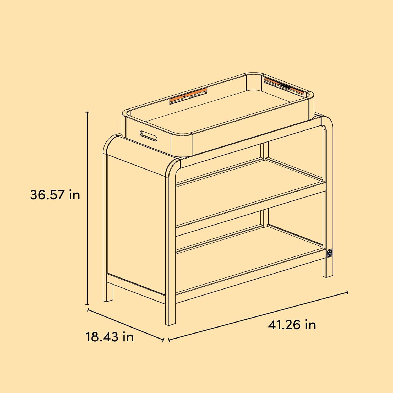 STURDY WOOD CONSTRUCTION, TIMELESS DESIGN: Clean lines, soft curves, and durable wood construction; Removable baby changing table topper fits any standard-size changing pad (changing pad not included); 2 open shelves for nursery, bedroom, & playroom storage