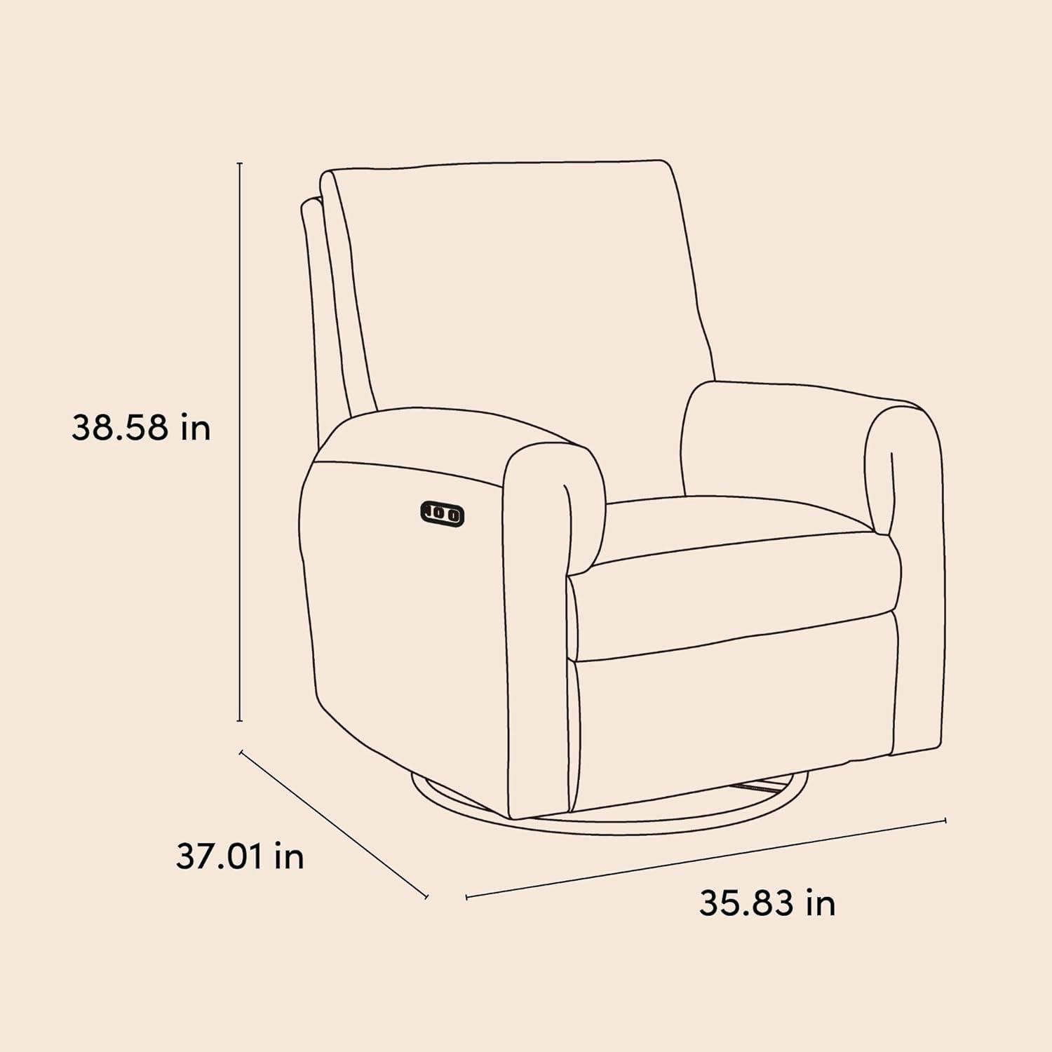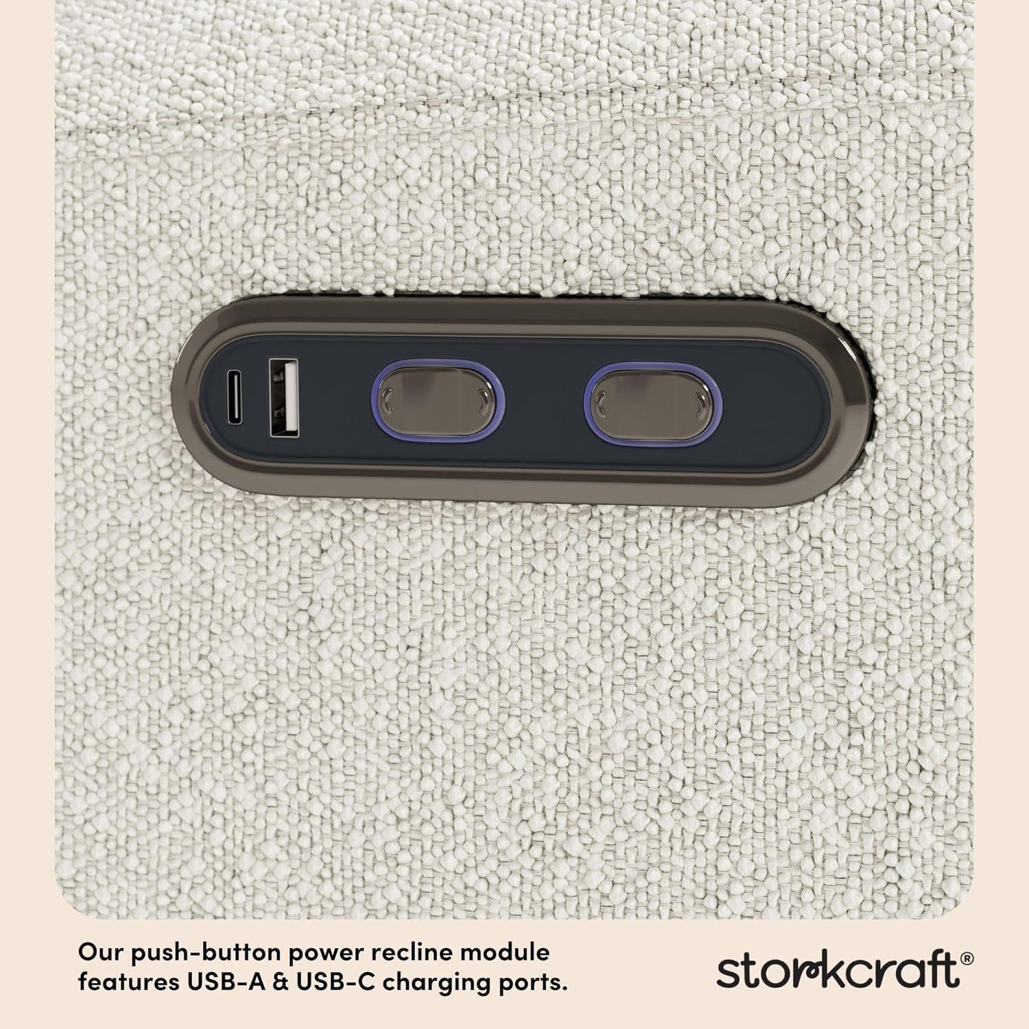 Introducing the elegant and innovative Storkcraft Sorrento Deluxe Nursery Power Recliner Swivel Glider — part of Storkcraft’s exclusive, ultra-premium “Art of Nursery” Collection. The Sorrento Deluxe Nursery Power Recliner Swivel Glider is a comfortable, relaxing nursery glider rocking chair, specifically designed for bonding moments with your newborn baby. The Sorrento’s gorgeous aesthetic is distinctly defined by its beautiful “modern reverse roll arm” upholstery — adding a dose of designer elegance to your nursery. More than just a nursery glider or rocking chair, the innovative Sorrento includes “push button” electronic power reclining, allowing you to lean back (and sit back up) with the easy push of a button. The Sorrento Deluxe Nursery Power Recliner Swivel Glider also includes a dual-USB charging port – equipped with both a USB-A and USB-C charging port to keep your smartphone, tablet, or e-reader charged, so you can focus on your baby. An original Storkcraft design, the Sorrento is exclusively manufactured by Storkcraft — North America’s longest-standing name in cribs, since 1945. The Sorrento is backed by Storkcraft’s one-year limited manufacturer’s warranty and supportive, real-life Customer Care team. Easy Assembly required. Power source (wall outlet) required. An exclusive, in-house, Storkcraft original design — and part of Storkcraft's flagship Art of Nursery Collection. Crafted with love, since 1945.